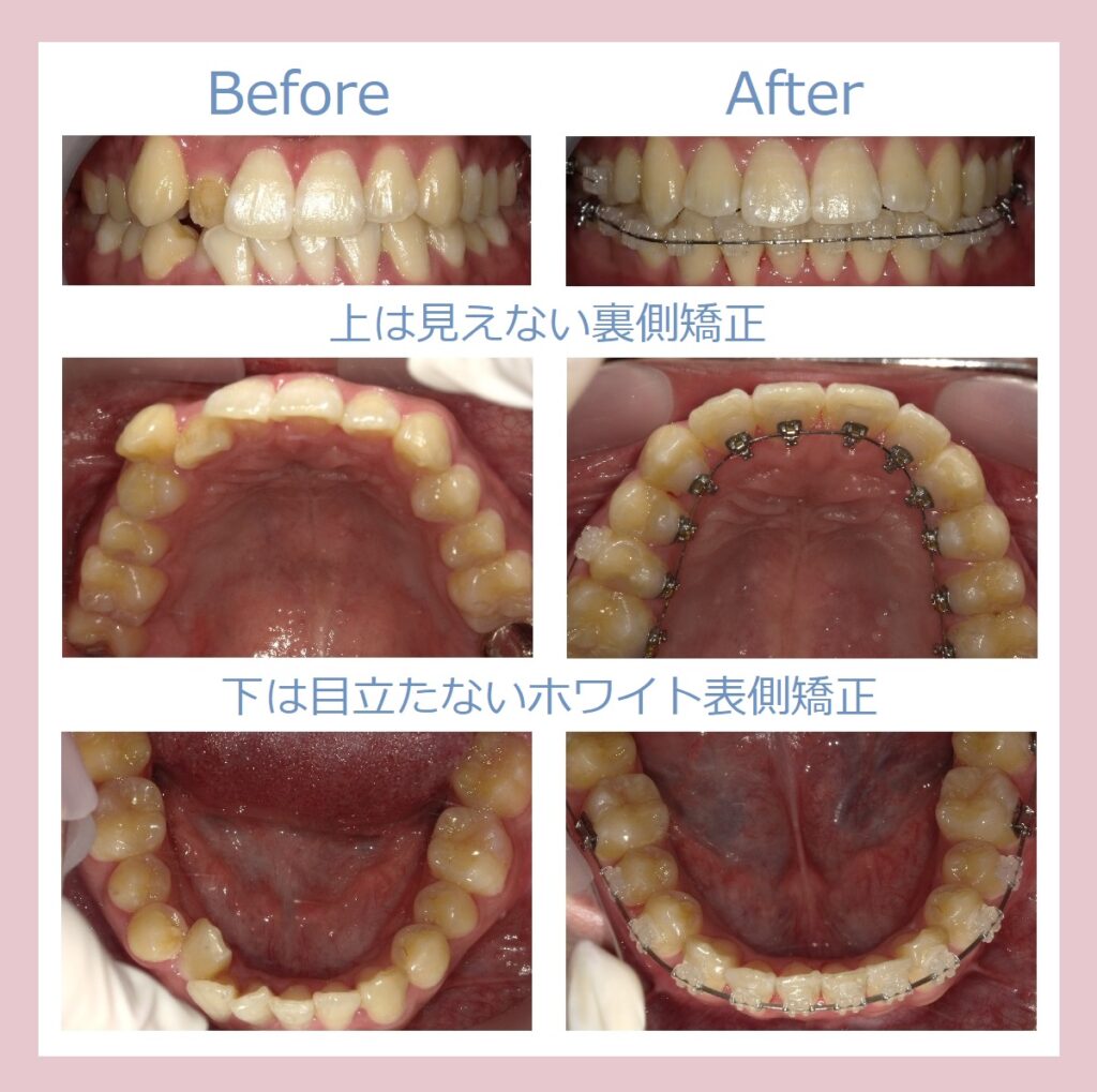 TBDC東京ビアンコ歯科・矯正歯科 渋谷院では、上の歯だけが裏側矯正、下の歯は目立たないホワイトの表側矯正になっています。